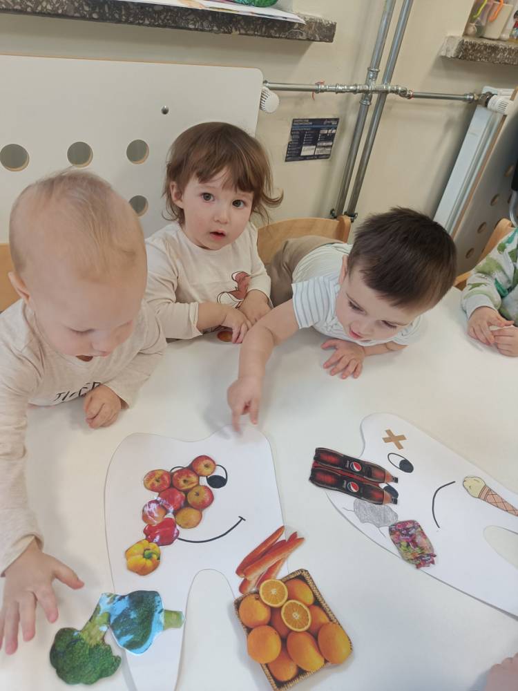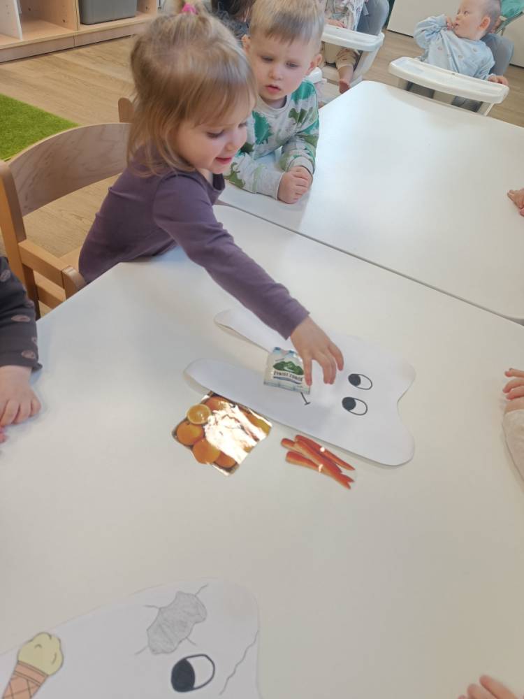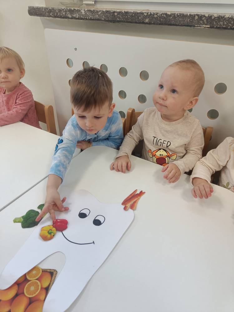 Dzieci poznały wesołego ząbka i smutnego ząbka, dzięki którym dowiedziały się, jakie produkty pomagają utrzymać zęby zdrowe, a jakie mogą im szkodzić.