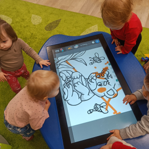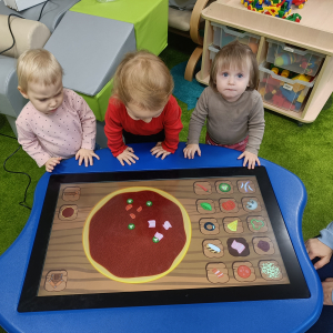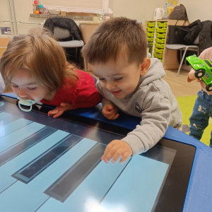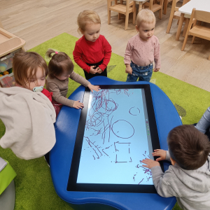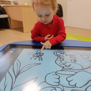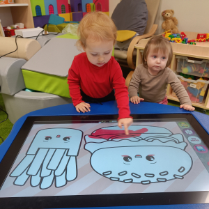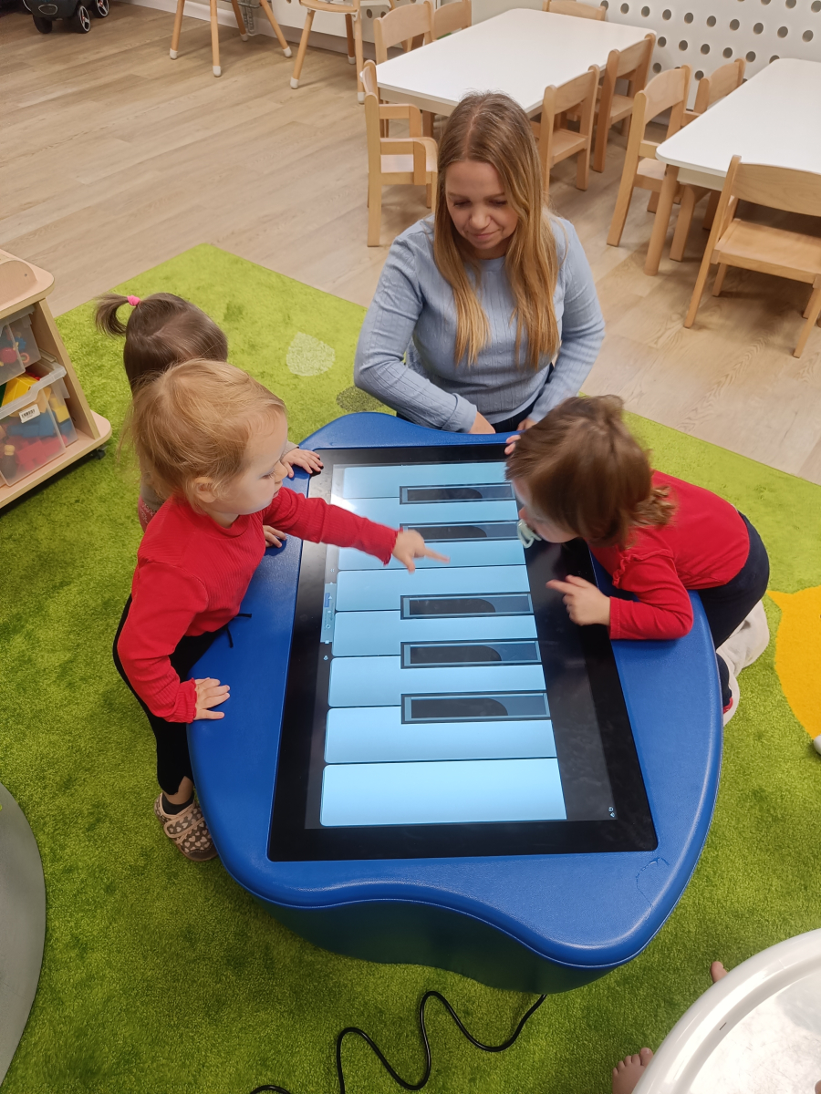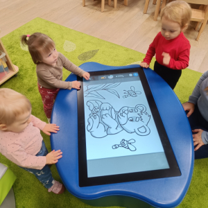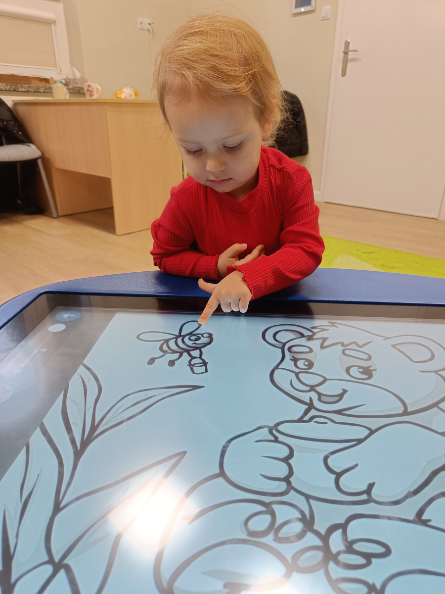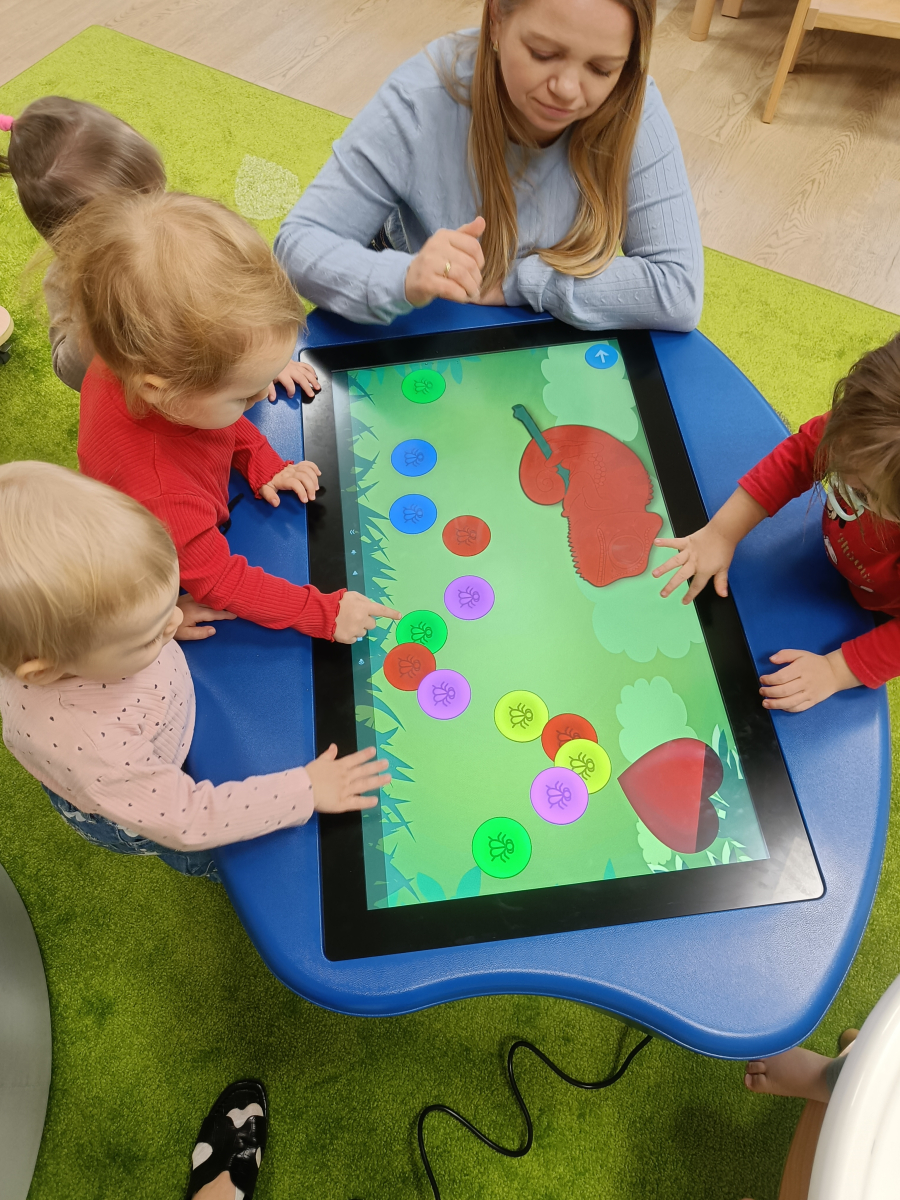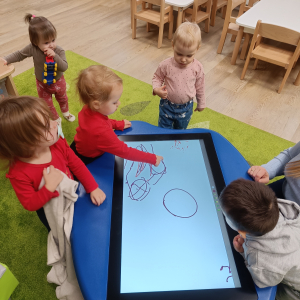 Maluchy mogły odkrywać kolory, kształty i dźwięki, a także rozwijać motorykę małą oraz logiczne myślenie poprzez zabawę. Interaktywny stolik zachęcał dzieci do wspólnego działania, dotykania, przesuwania i eksperymentowania — a radości było co niemiara!