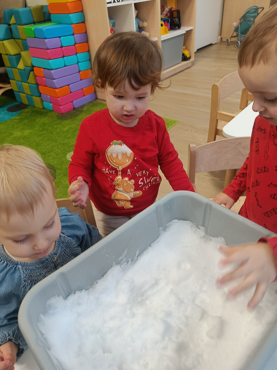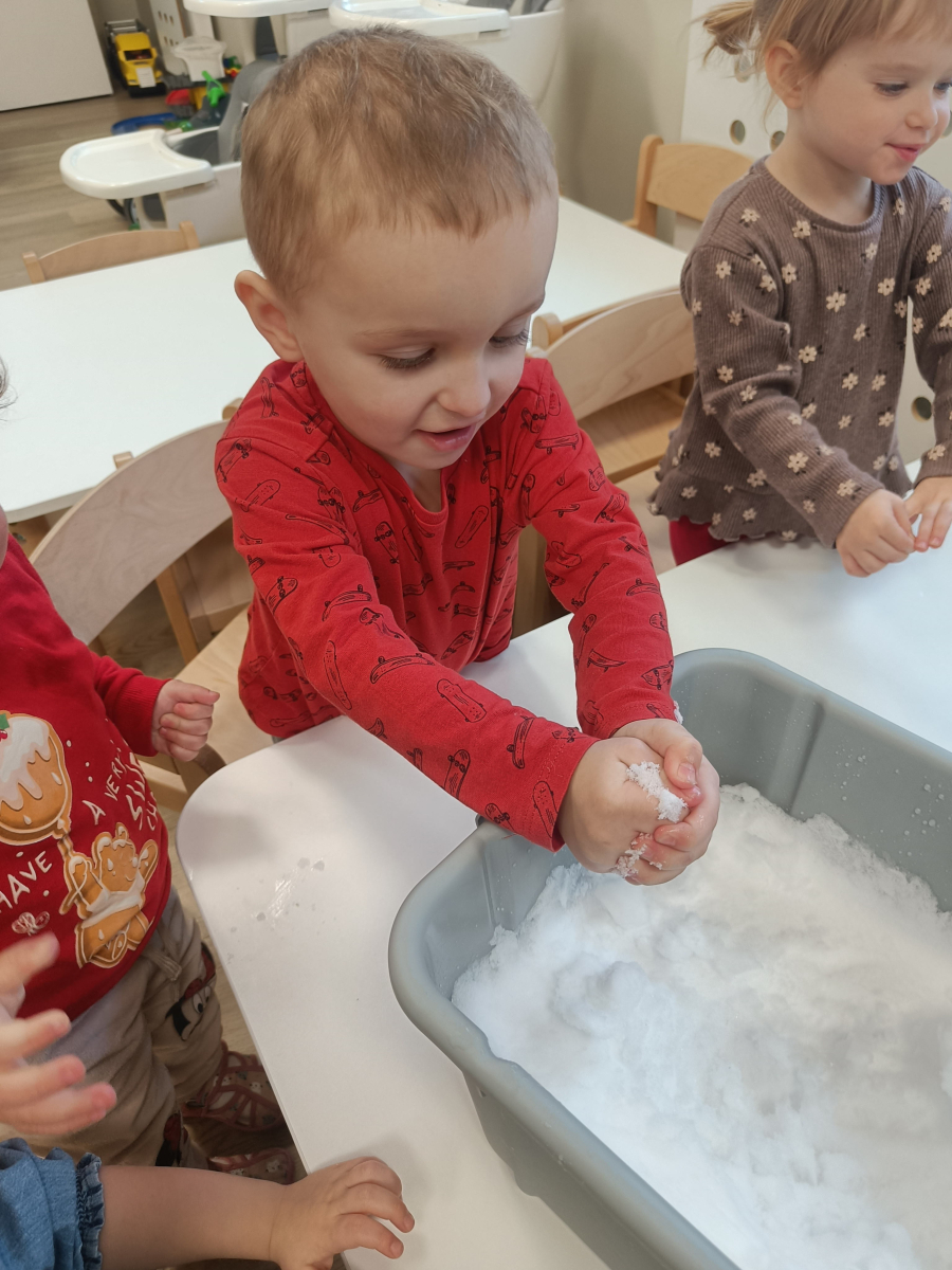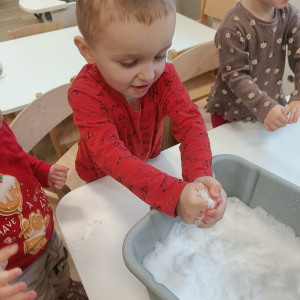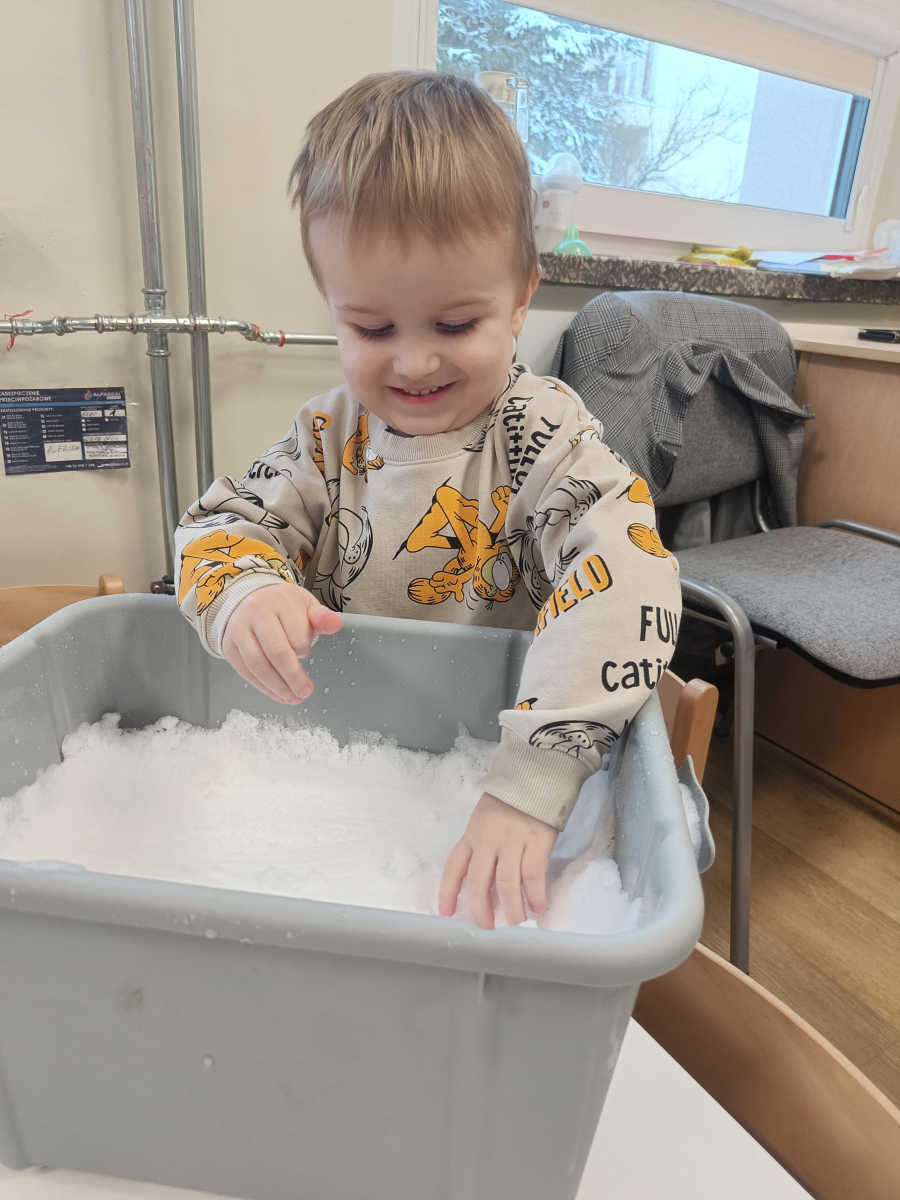 Dzieci miały okazję doświadczać różnych faktur i temperatur poprzez dotykanie śniegu, co było świetnym ćwiczeniem sensorycznym.