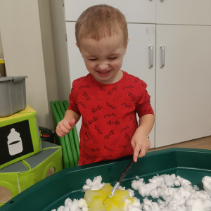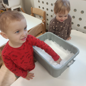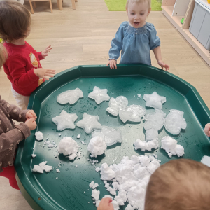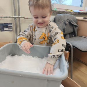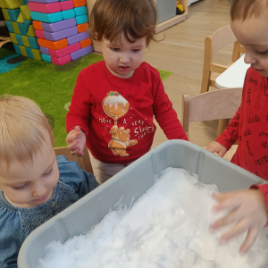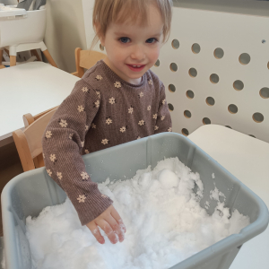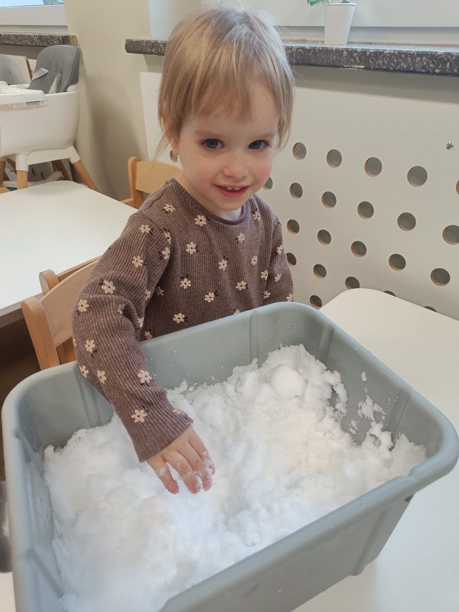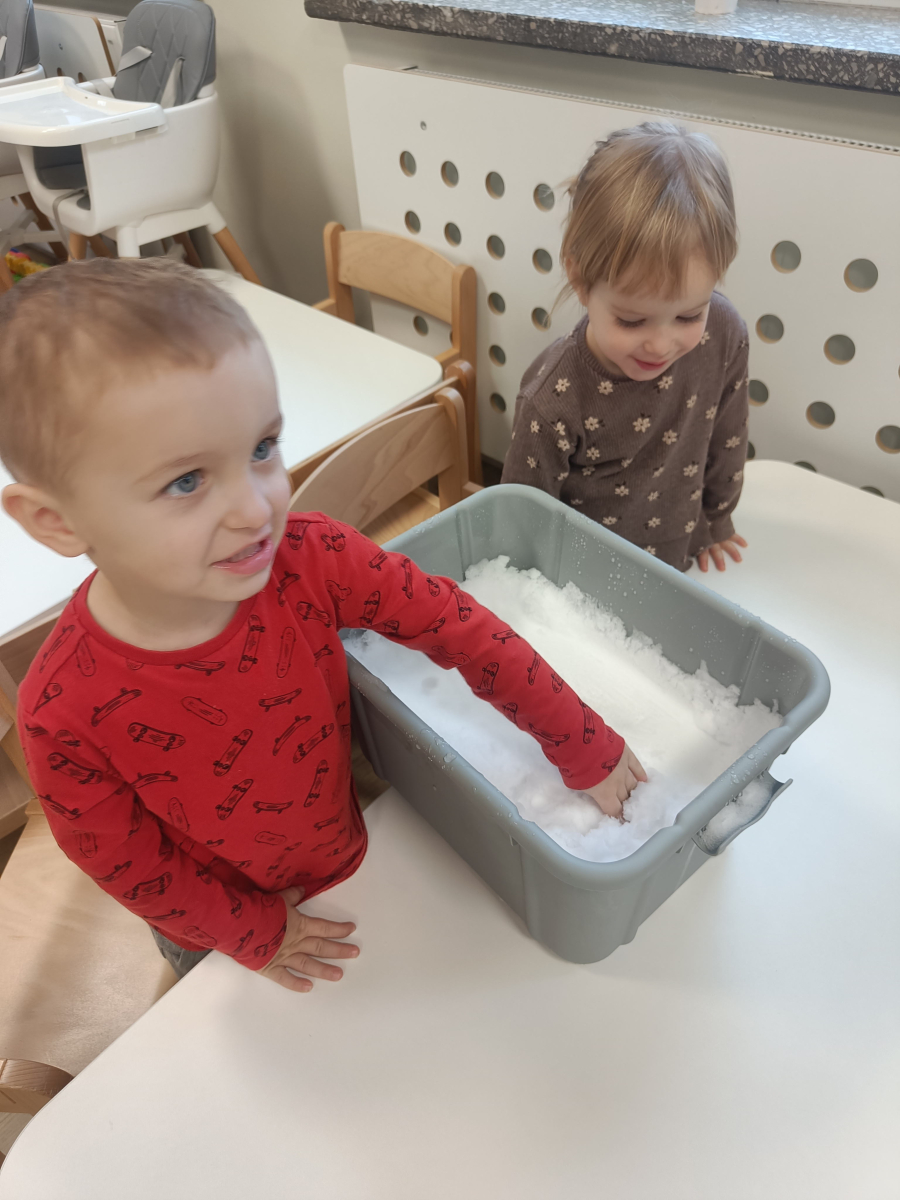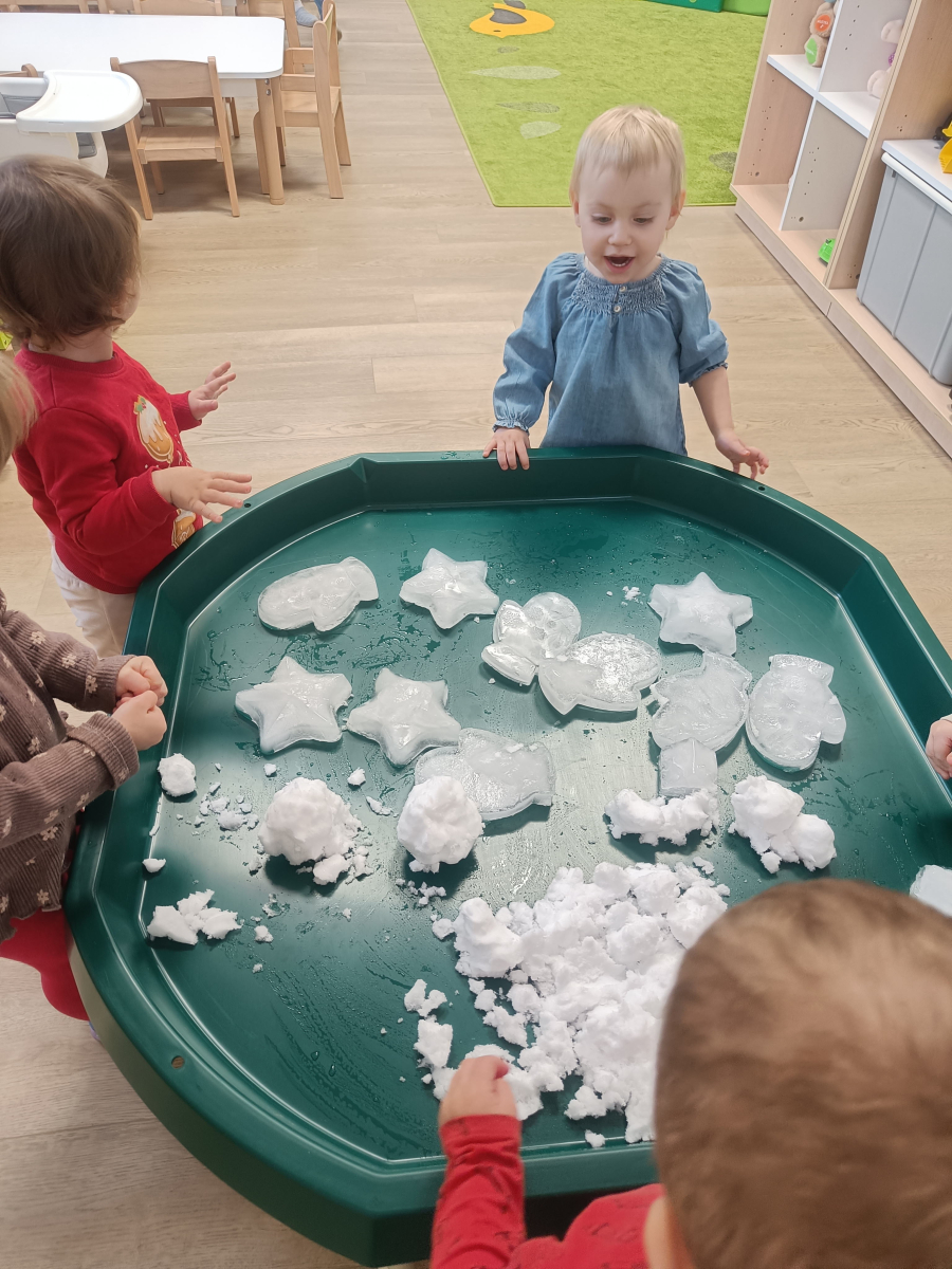 Dzieci miały okazję doświadczać różnych faktur i temperatur poprzez dotykanie śniegu, co było świetnym ćwiczeniem sensorycznym.