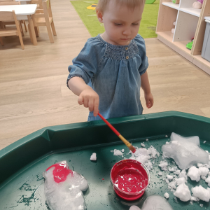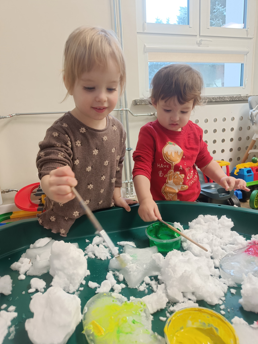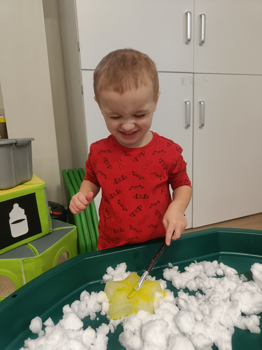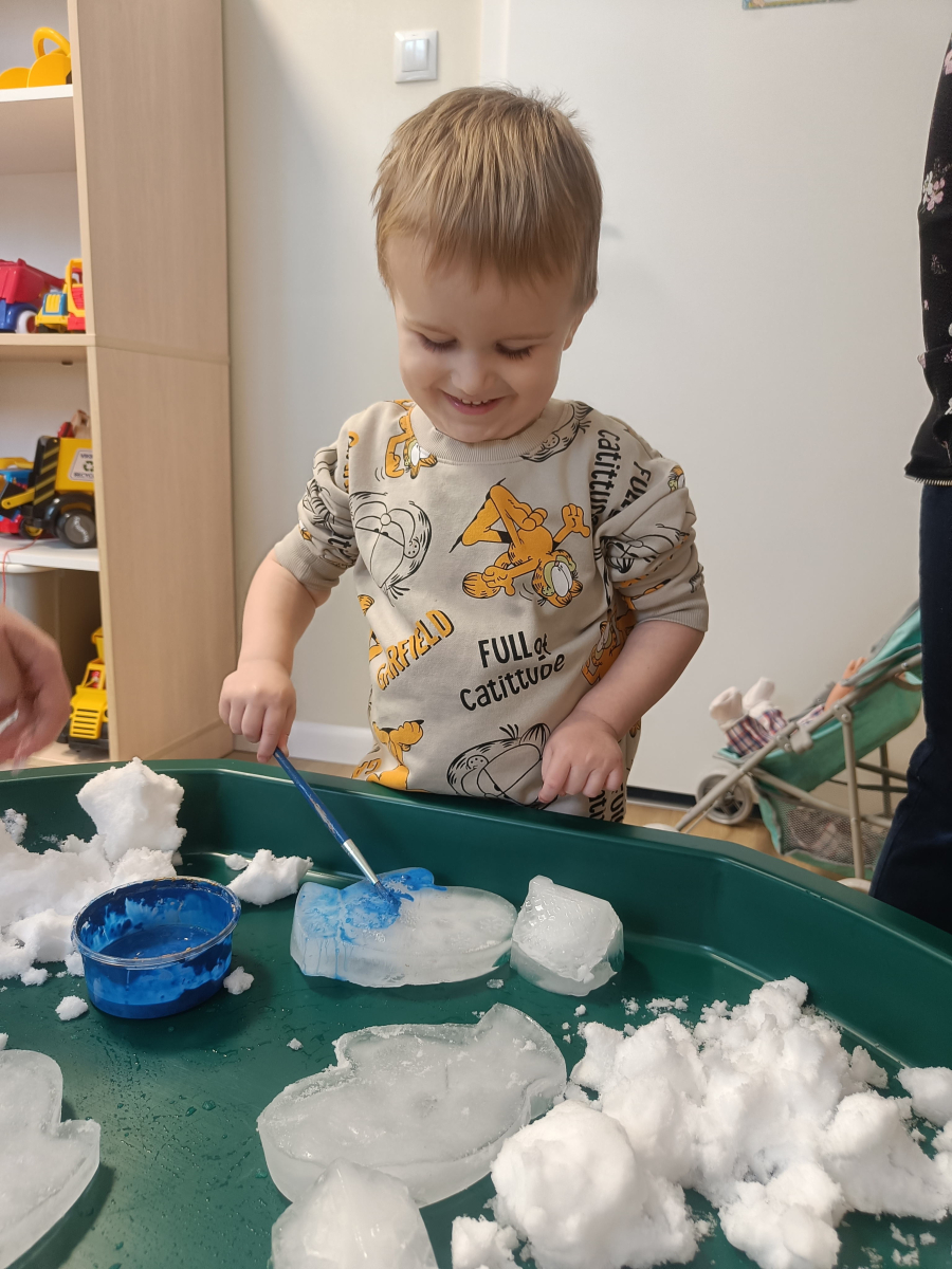 Malowaliśmy śnieg farbami, obserwując, jak zmienia kolory, a także malowaliśmy formy lodowe, rozwijając kreatywność i sprawność manualną.