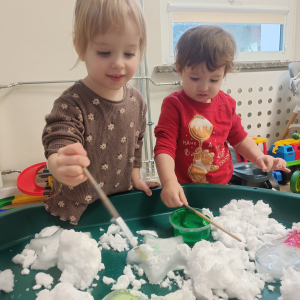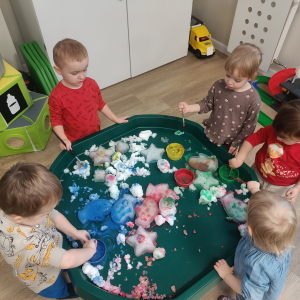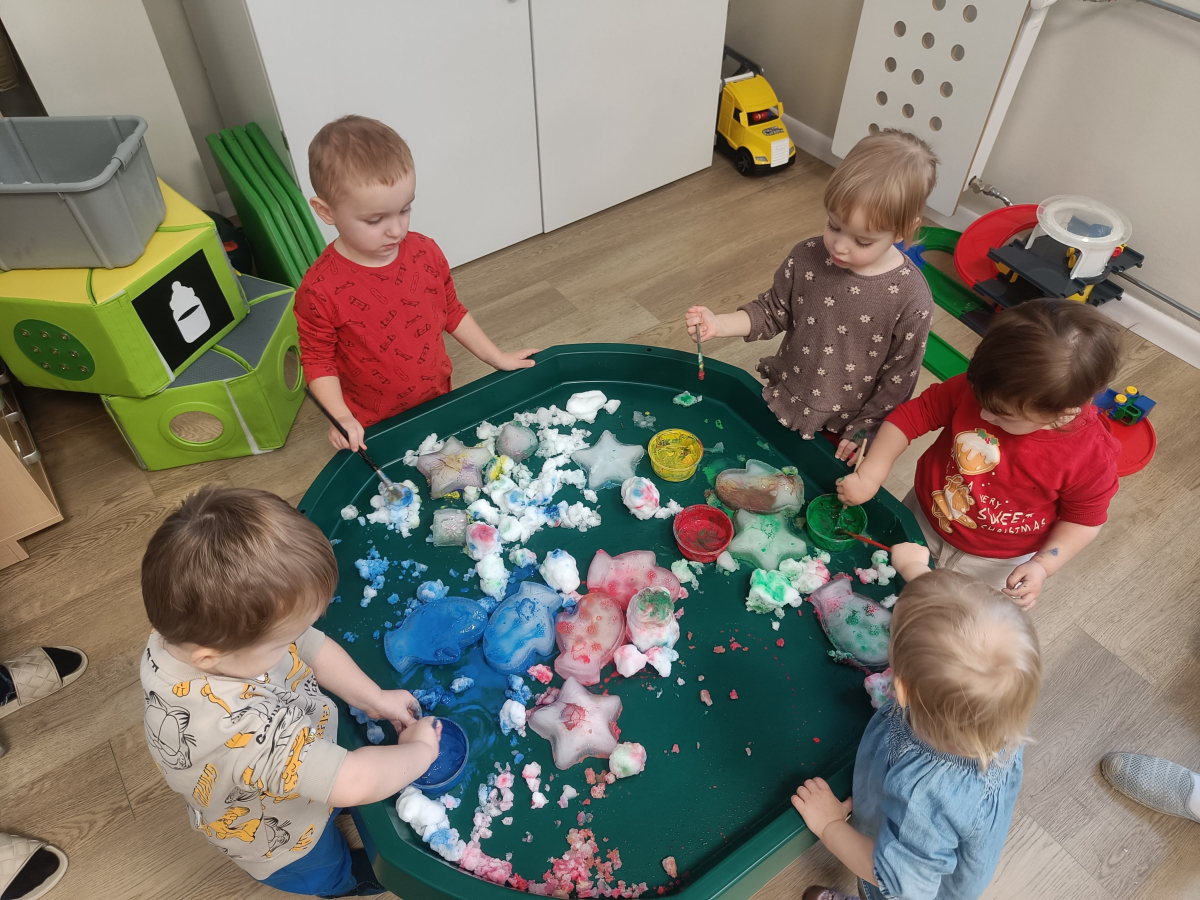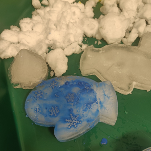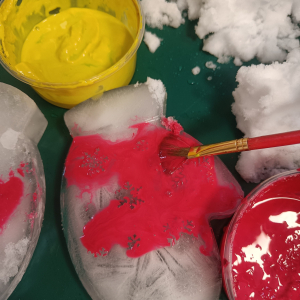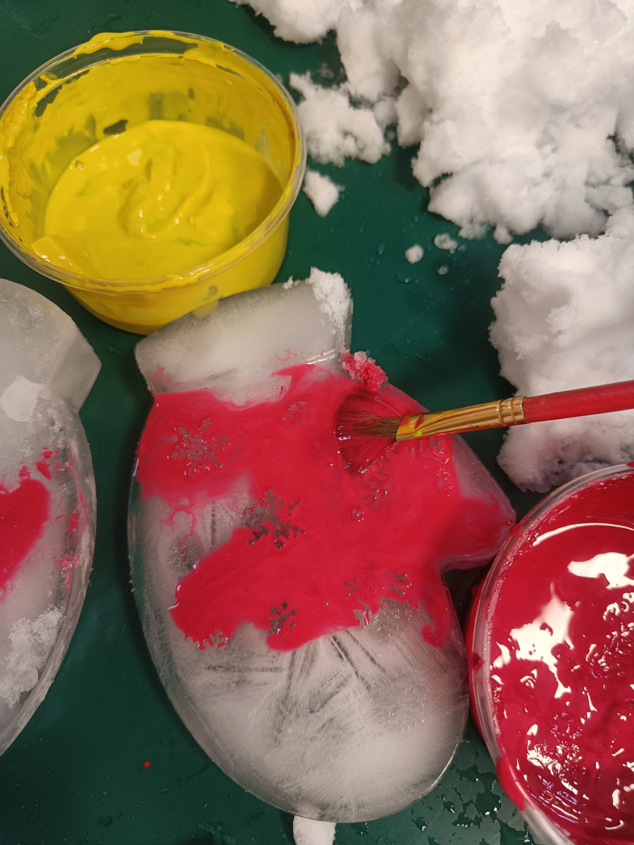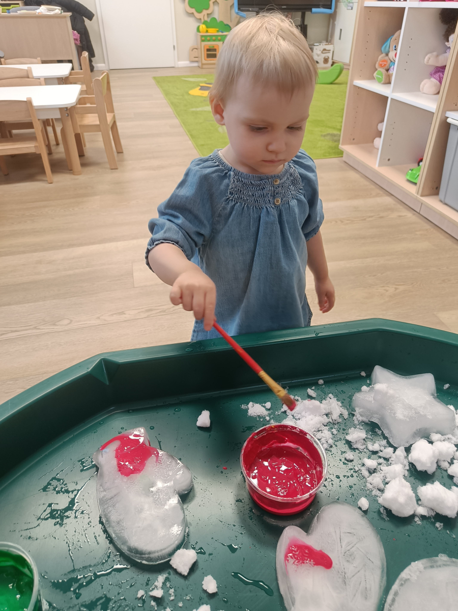 Malowaliśmy śnieg farbami, obserwując, jak zmienia kolory, a także malowaliśmy formy lodowe, rozwijając kreatywność i sprawność manualną.