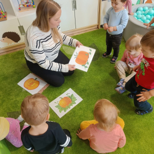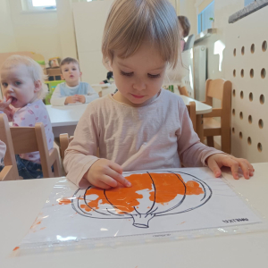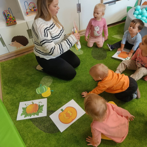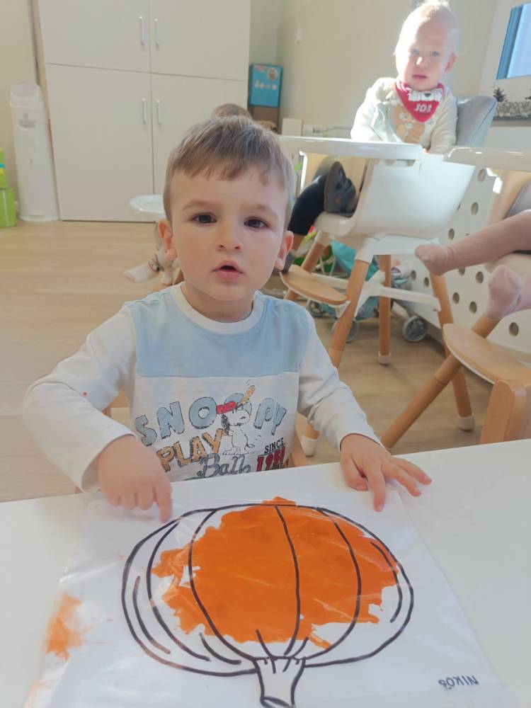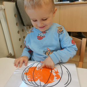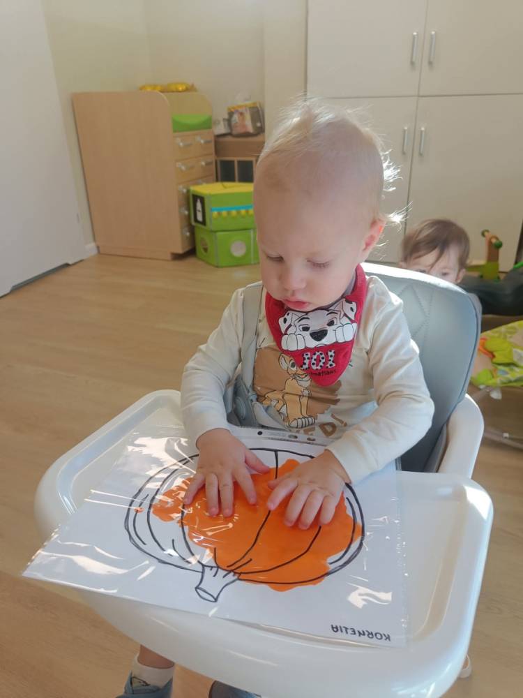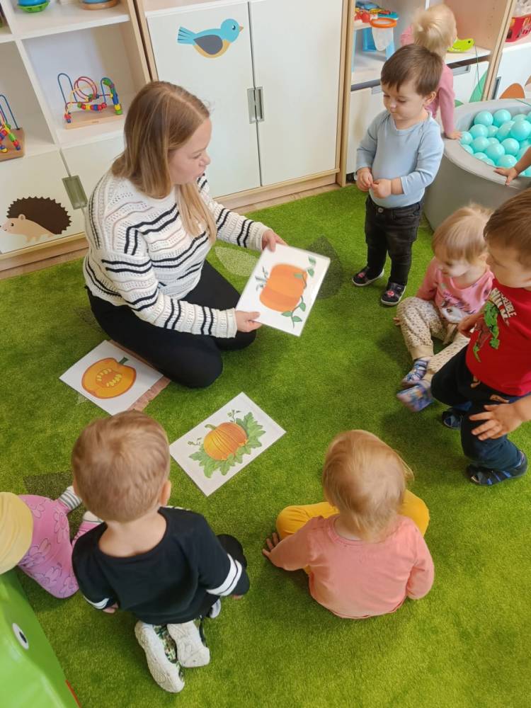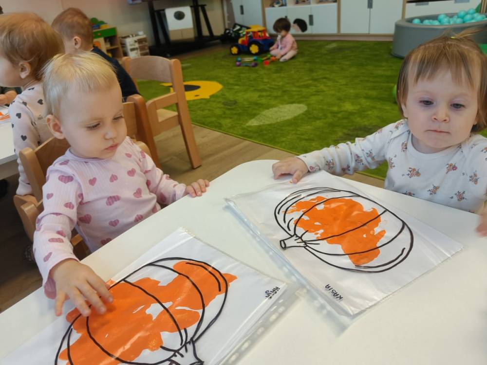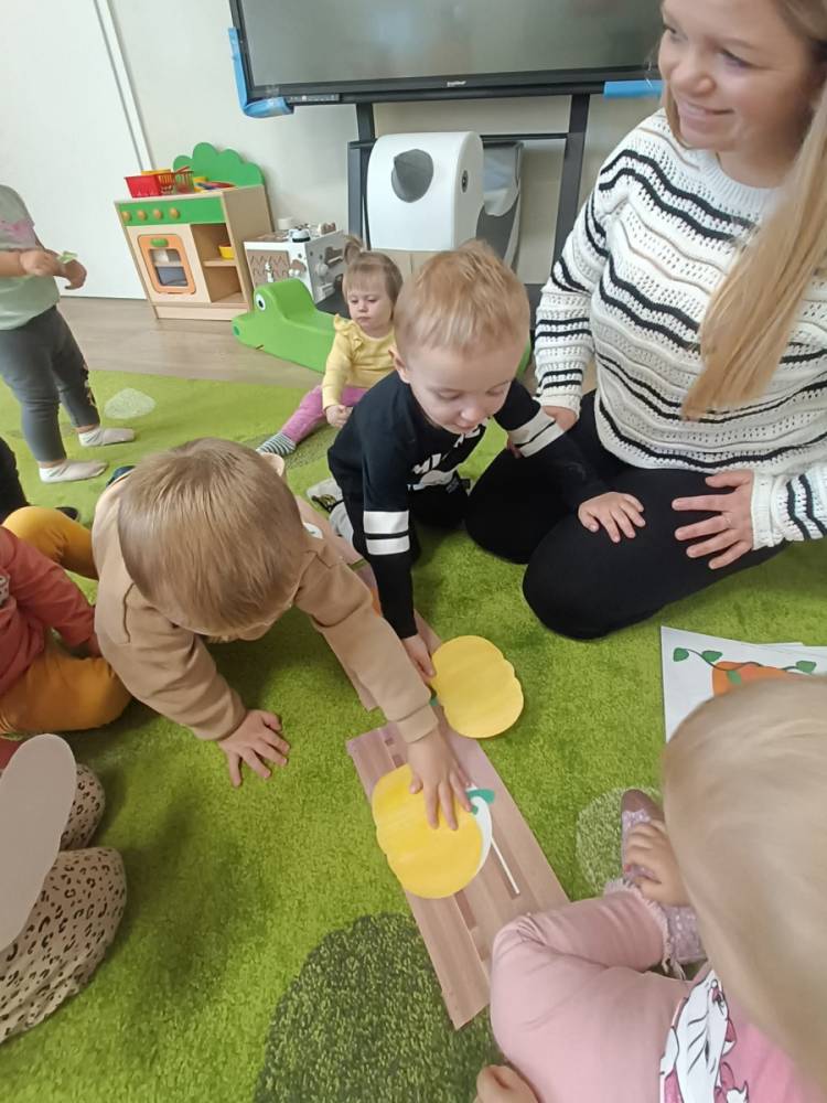 - segregowały dynie według koloru – do pomarańczowych, żółtych i zielonych skrzynek, ćwicząc przy tym umiejętność klasyfikowania i rozpoznawania barw,
