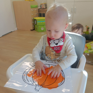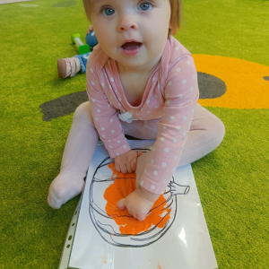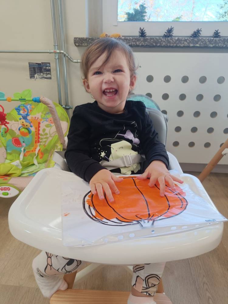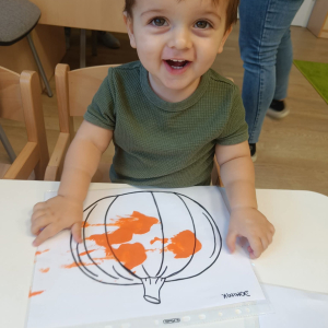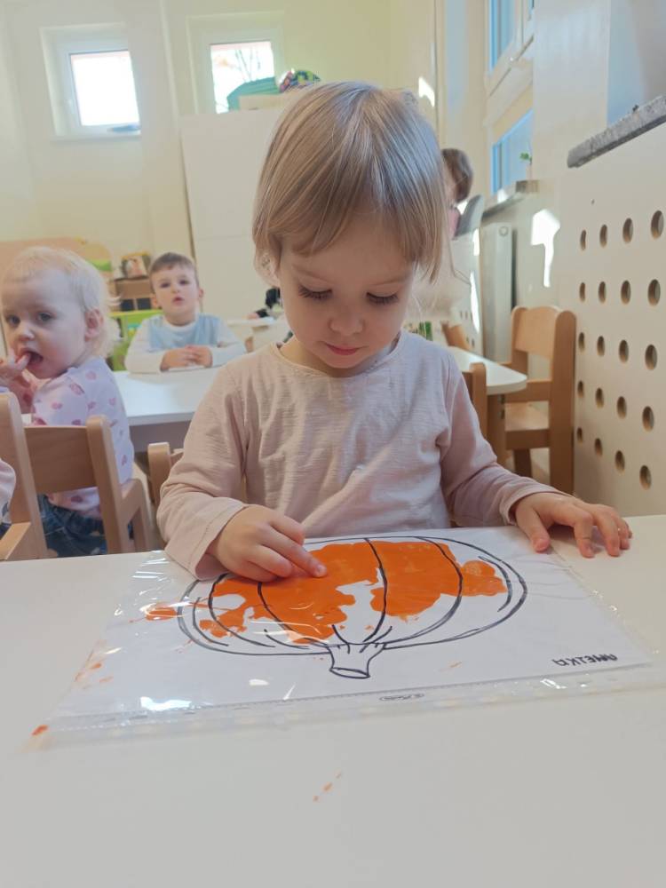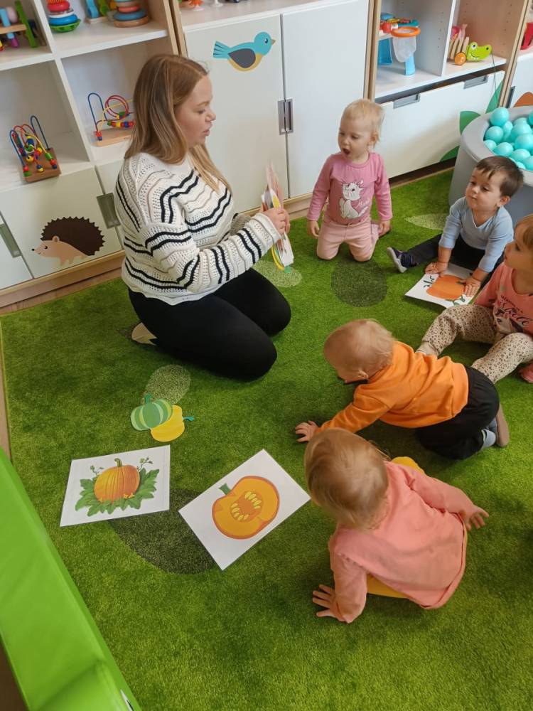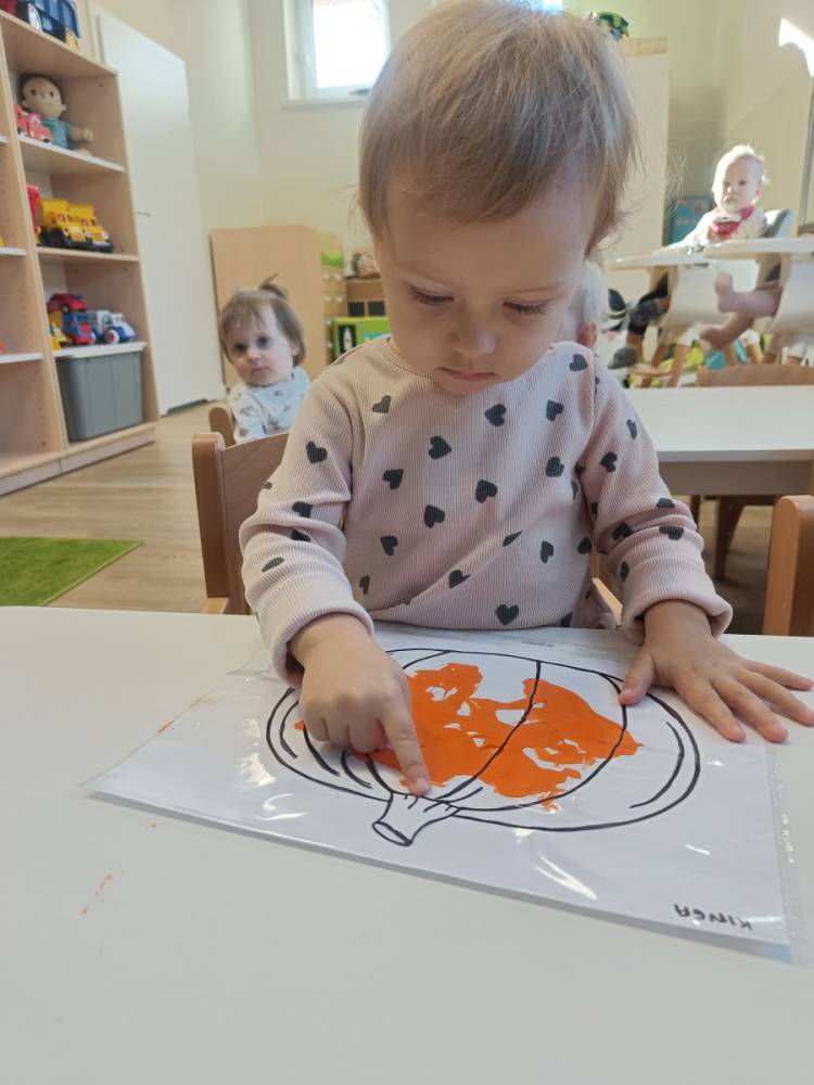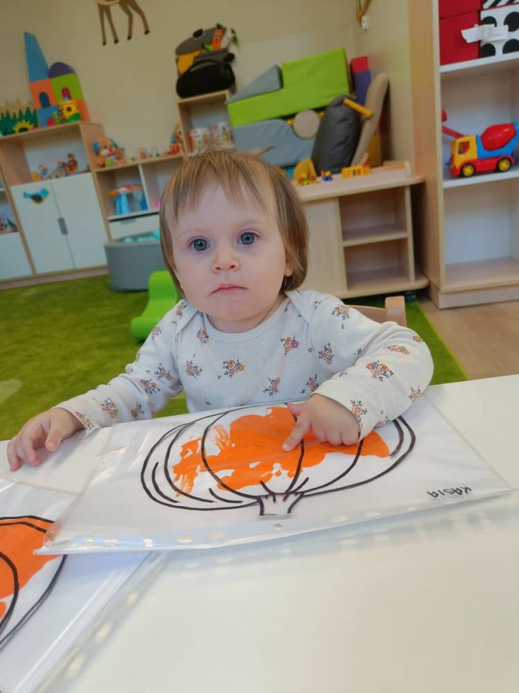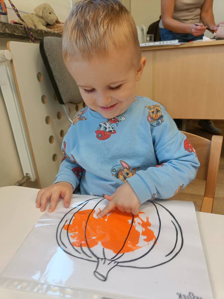 - segregowały dynie według koloru – do pomarańczowych, żółtych i zielonych skrzynek, ćwicząc przy tym umiejętność klasyfikowania i rozpoznawania barw,