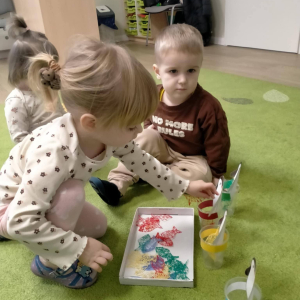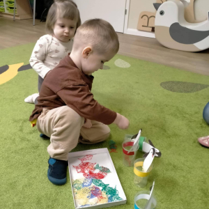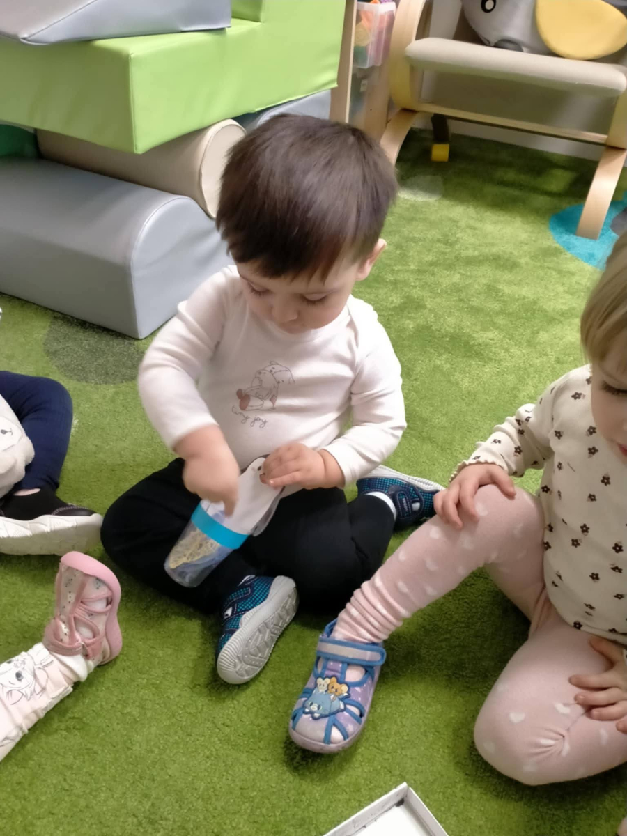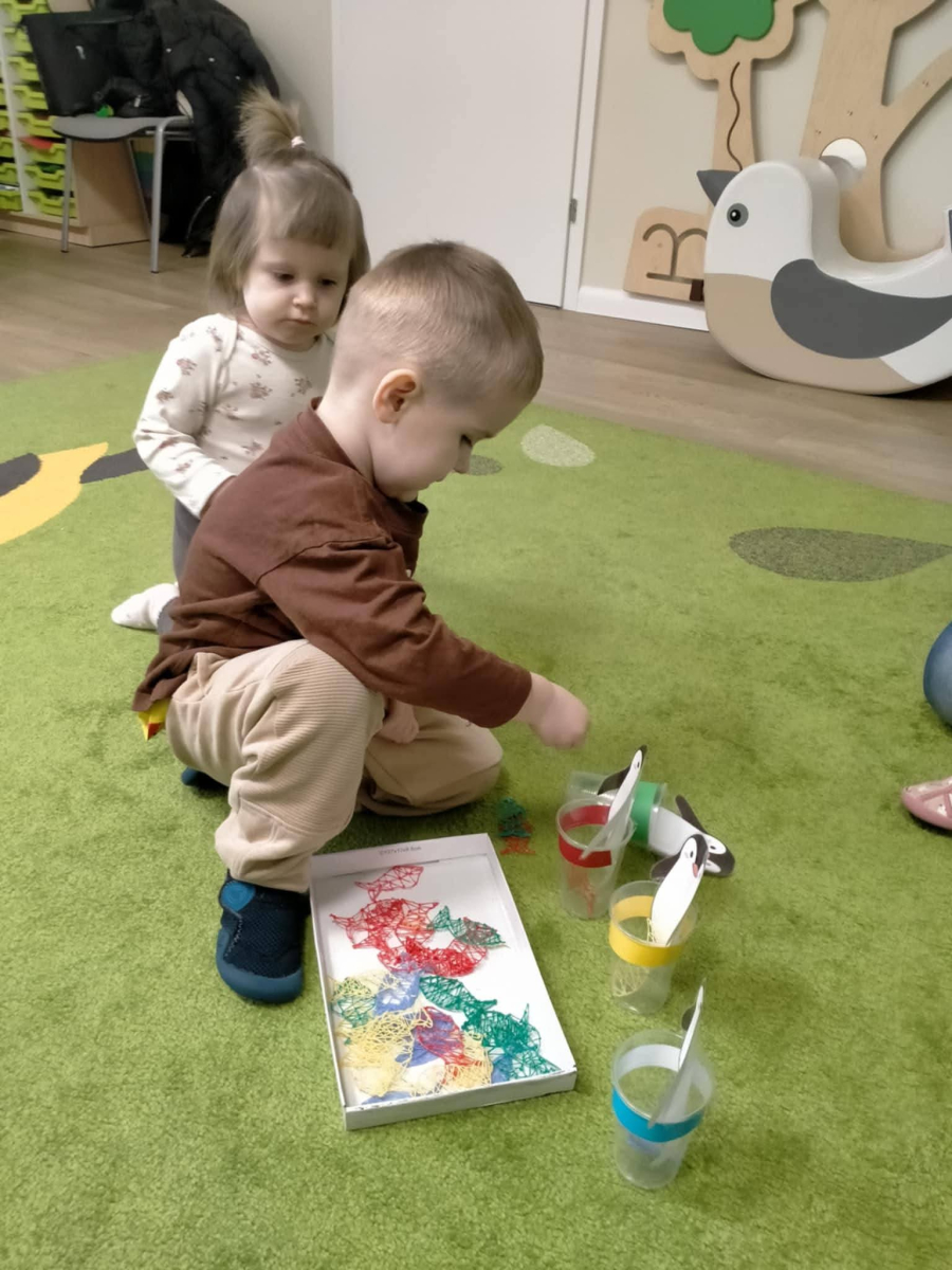 Dzieci segregowały kolorowe rybki, dopasowując je do odpowiednich kubeczków – ćwiczyliśmy w ten sposób rozpoznawanie kolorów, koncentrację oraz sprawność małych rączek.