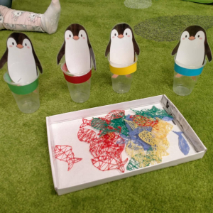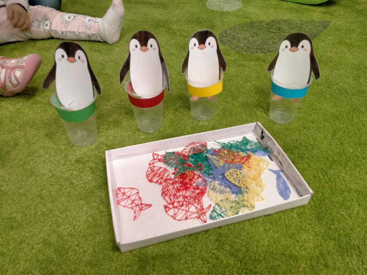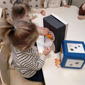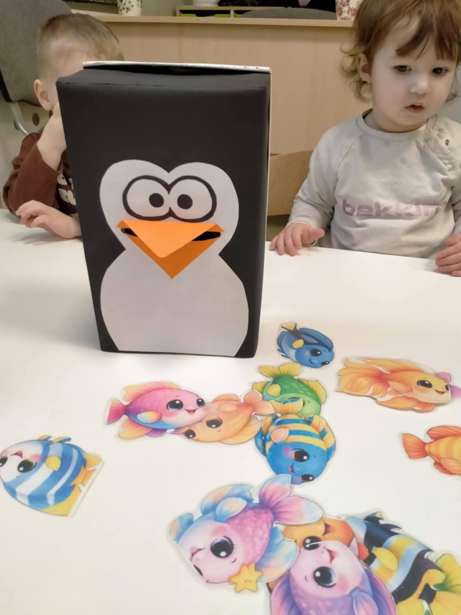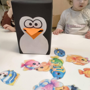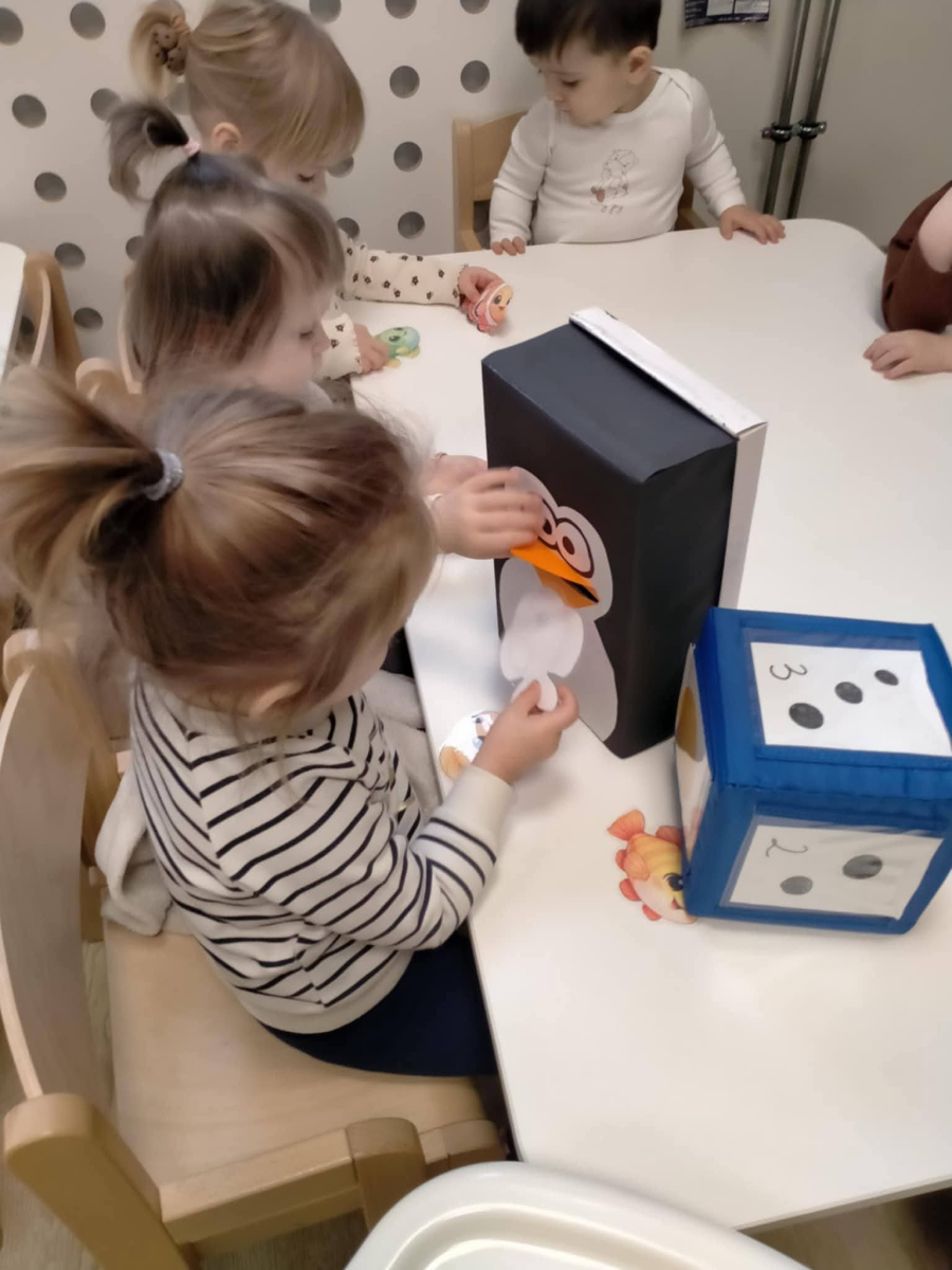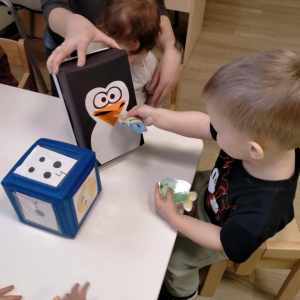 Nie zabrakło także zajęć matematycznych! Dzieci karmiły sympatycznego pingwinka, wrzucając mu dokładnie tyle rybek, ile kropek wskazywała kostka. Liczenie, obserwowanie i radość z poprawnie wykonanego zadania sprawiły maluchom mnóstwo frajdy.